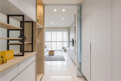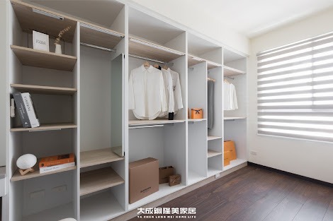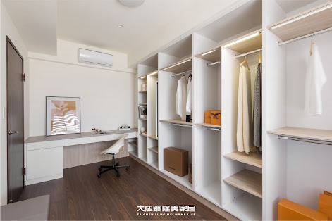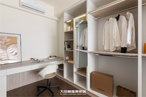 此空間兼具書房與更衣室功能, 以白色與木質系統櫃構成 清爽、實用、擴充性高 的生活介面。 開放格、衣桿與層板依使用頻率排列, 搭配長形木紋書桌,形成能兼用工作、閱讀、化妝的彈性配置, 也是符合三口之家成長與變化最重要的空間預留。