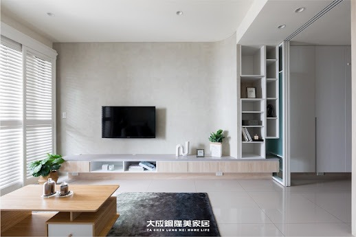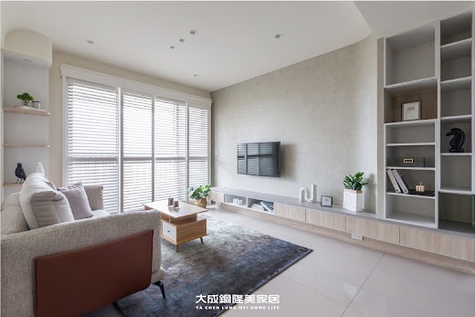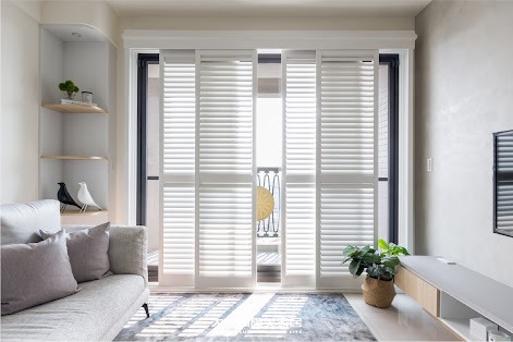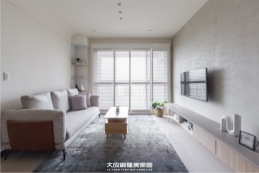 以白色牆面與淺灰霧面電視牆構築乾淨視覺, 搭配低矮電視櫃拉長水平線,使空間看起來更寬闊。 大片白色百葉窗是公領域的靈魂, 光線透過葉片傾斜散落於木質地與茶几上, 呈現北歐特有的柔光感。 軟裝部分以灰階地毯、淺木茶几與簡潔綠植點綴, 構成一個能真正「停留」與「放鬆」的家居場景。