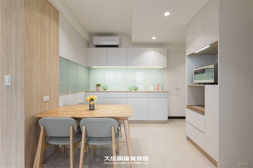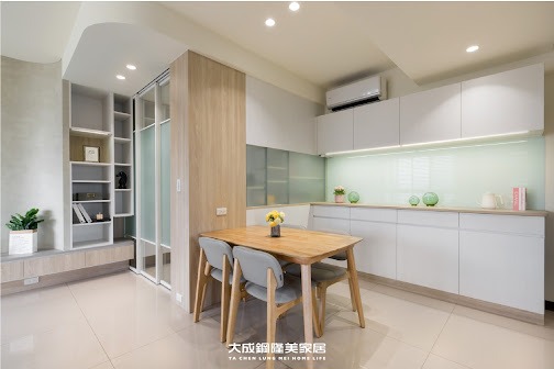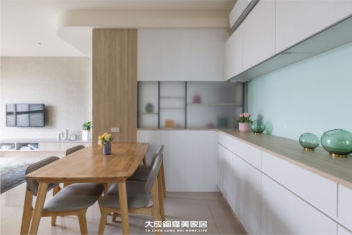 餐廳以大容量上櫃+下櫃 串起整體視線, 中段加入磨砂烤漆玻璃作為半展示半收納的鏤空區塊, 讓牆面既有節奏,也有呼吸。 木質餐桌、灰色北歐椅與溫和的照明組合, 讓餐廳成為家中最具「生活感」的所在 能吃飯、能聊天、能陪伴孩子完成創作與作業。