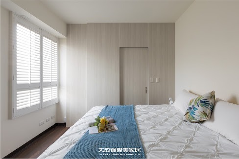 主臥以柔和為核心語彙, 白色主牆搭配整面淺木系統床頭板, 並以隱藏門方式整併動線,讓視覺極致簡化。 從百葉窗灑落的自然光與淺木地板相互呼應, 營造舒緩且安定的休息氛圍。